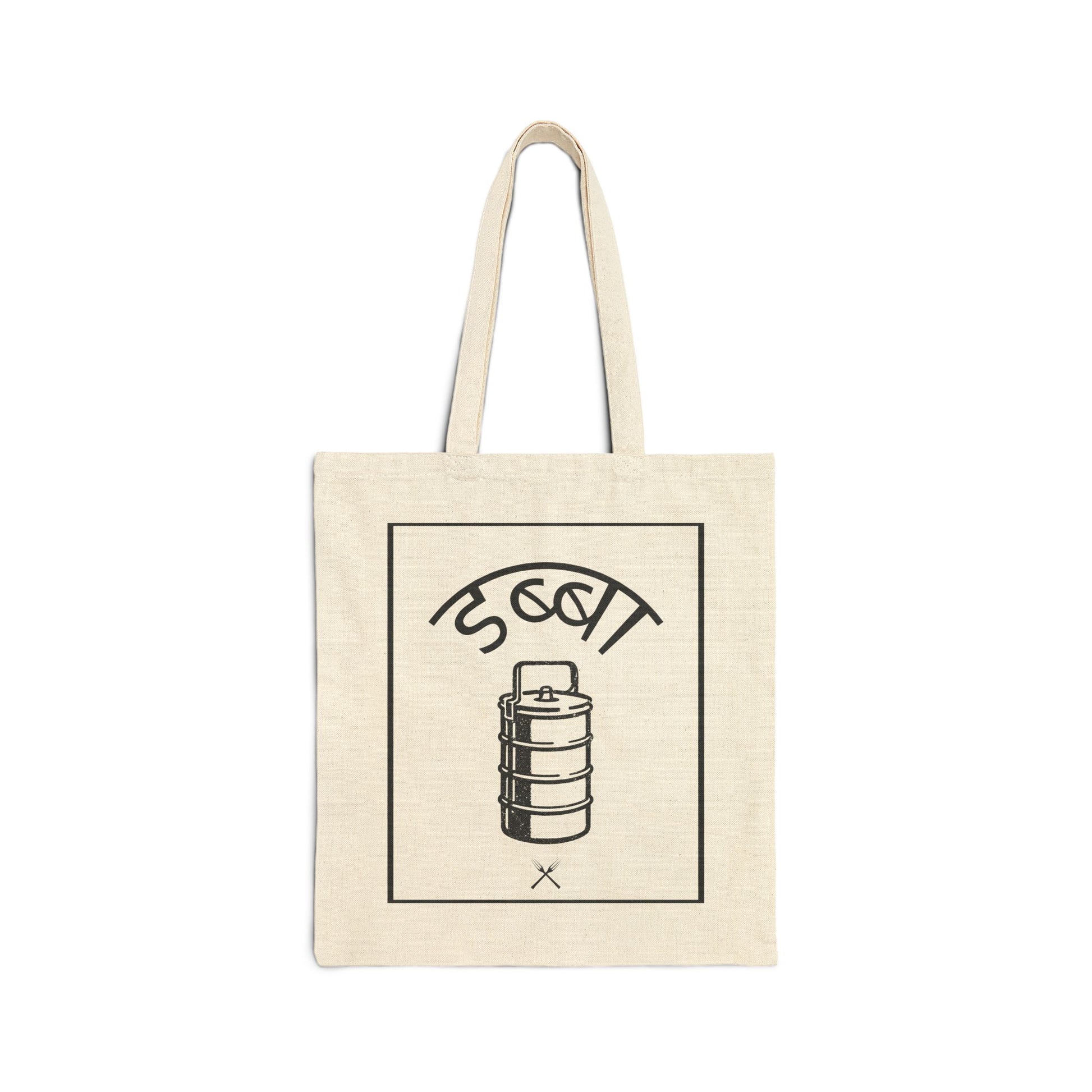 Introducing a minimalist Cotton Canvas Tote that pairs everyday function with Indian cultural grit: a bold, black stencil of a stacked metal lunchbox—known locally as the dabba—sits centered inside a clean frame on natural canvas for a timeless, street‑modern look.